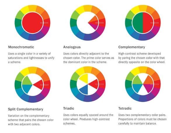 There a six main colour theory rules relating to colour and colour combinations and once these concepts are understood it is easier to understand how, and why, colours can work together.
